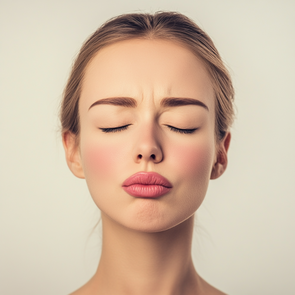 Cara groga amb els dos ulls tancats i la boca plana i tancada. Igual que el nom, la cara no mostra cap expressió. Es pot utilitzar per mostrar molèstia o irritació, decepció i exasperació.
